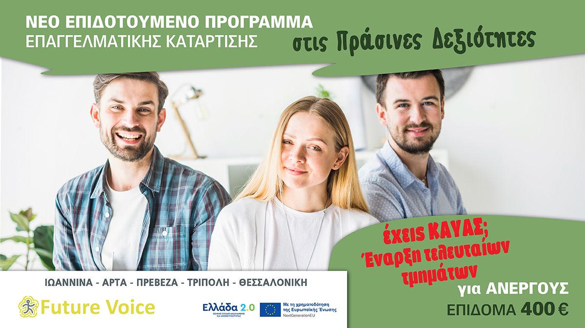 Νέο επιδοτούμενο πρόγραμμα Ανέργων Voucher με επιδότηση 400€ και 80 ώρες κατάρτισης στις Πράσινες Δεξιότητες.